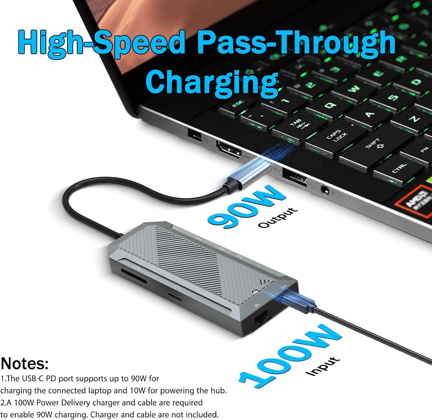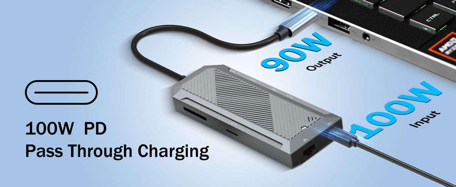Sokongan penghantaran kuasa memastikan peranti kekal dicas semasa hab sedang digunakan. Port USB-C PD membenarkan kuasa melalui hab dan ke dalam komputer riba atau tablet yang disambungkan.