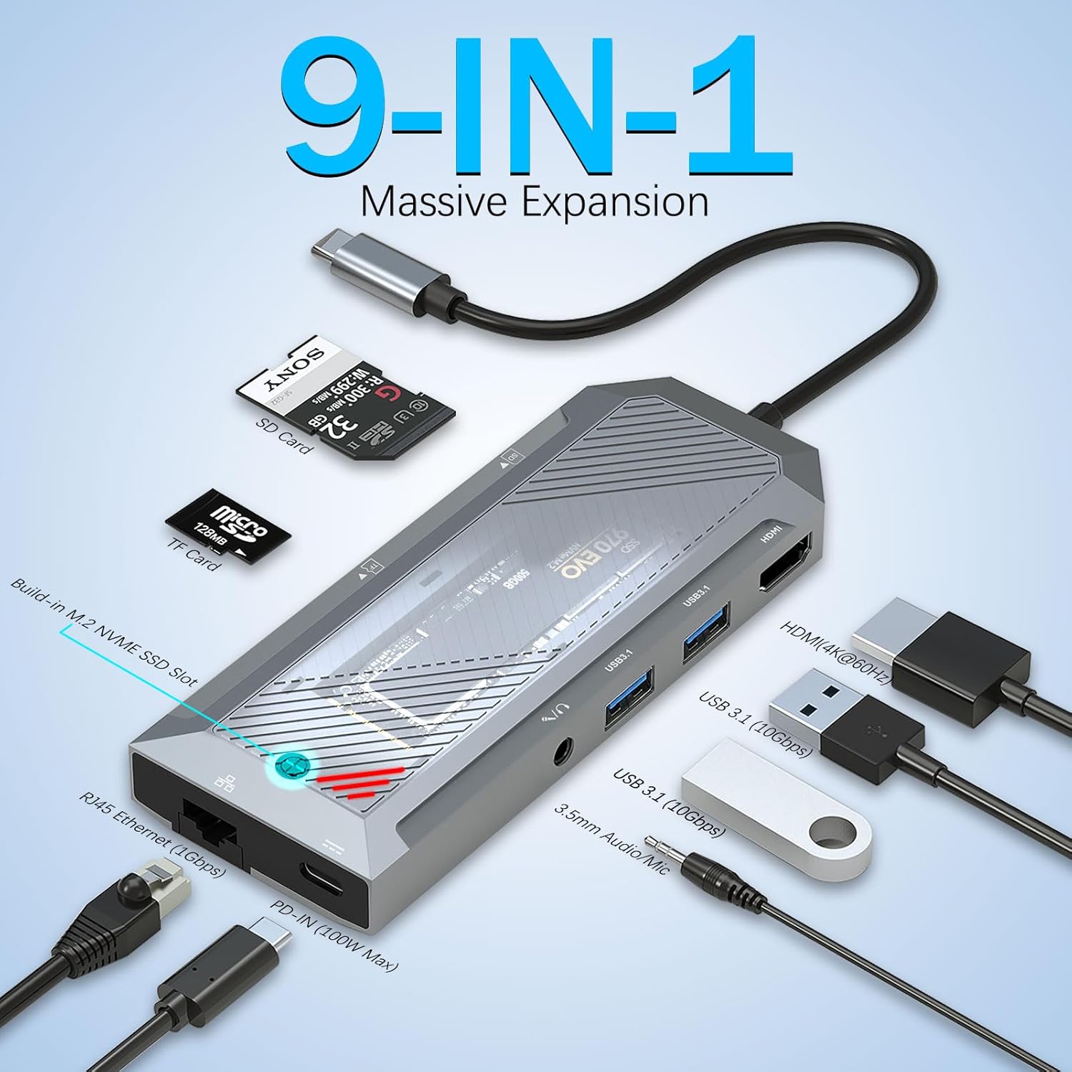 Hab USB-C 9-dalam-1 dengan Penutup SSD untuk Pemisah HDMI M.2 NVMe 4K 60Hz – Ketersambungan Mutlak dan Peluasan Storan Berkelajuan Tinggi