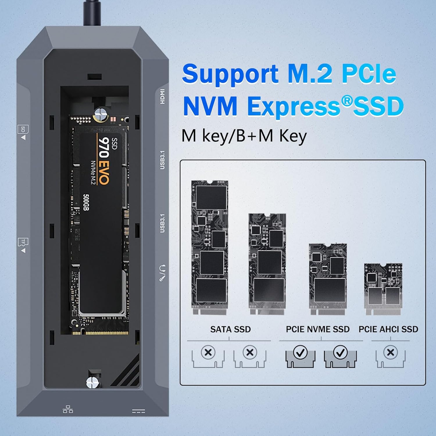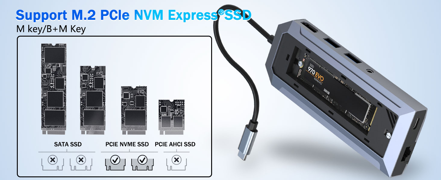 Salah satu ciri menonjol Hab USB-C 9-dalam-1 dengan Kepungan SSD untuk Pemisah HDMI M.2 NVMe 4K 60Hz ialah kepungan SSD M.2 NVMe terbina dalamnya. Ini membolehkan pengguna memasang pemacu keadaan pepejal NVMe berkelajuan tinggi terus ke dalam hab.