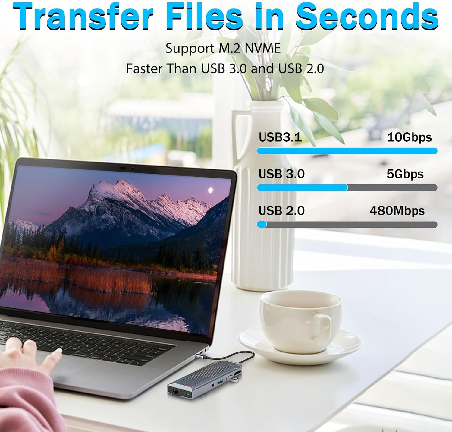 CHUANGQUAN 9-dalam-1 USB-C Hub dengan SSD Enclosure untuk M.2 NVMe 4K 60Hz HDMI Splitter mengembangkan sambungan dengan storan sangat pantas, paparan 4K yang terang dan port serba boleh, memberikan prestasi yang cekap untuk pencipta, profesional dan ruang kerja berbilang tugas.