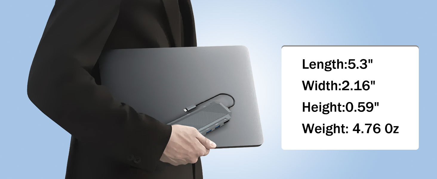 Walaupun fungsinya yang berkuasa, Hab USB-C 9-dalam-1 dengan SSD Enclosure untuk M.2 NVMe 4K 60Hz HDMI Splitter direka untuk kekal padat dan ringan. Ini menjadikannya mudah dibawa dalam beg komputer riba, beg galas atau bekas perjalanan.