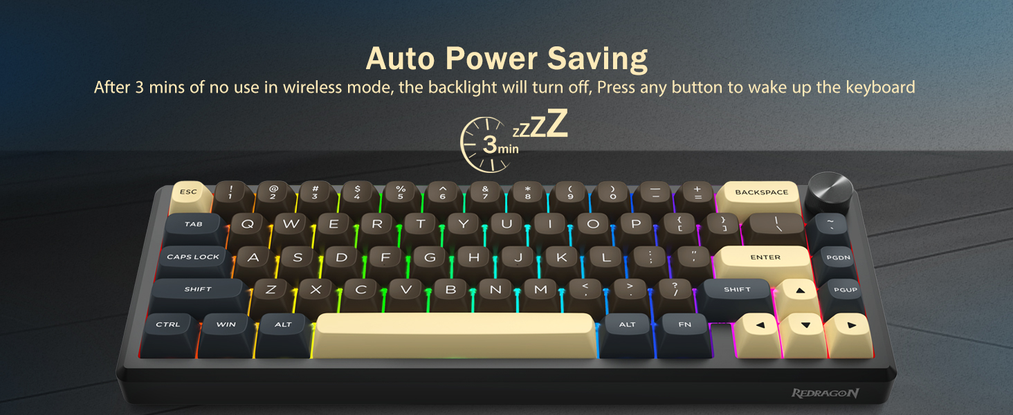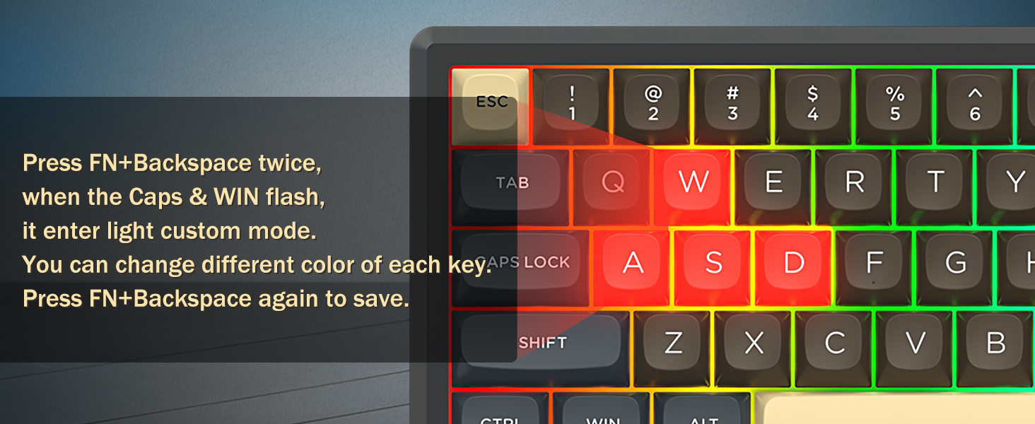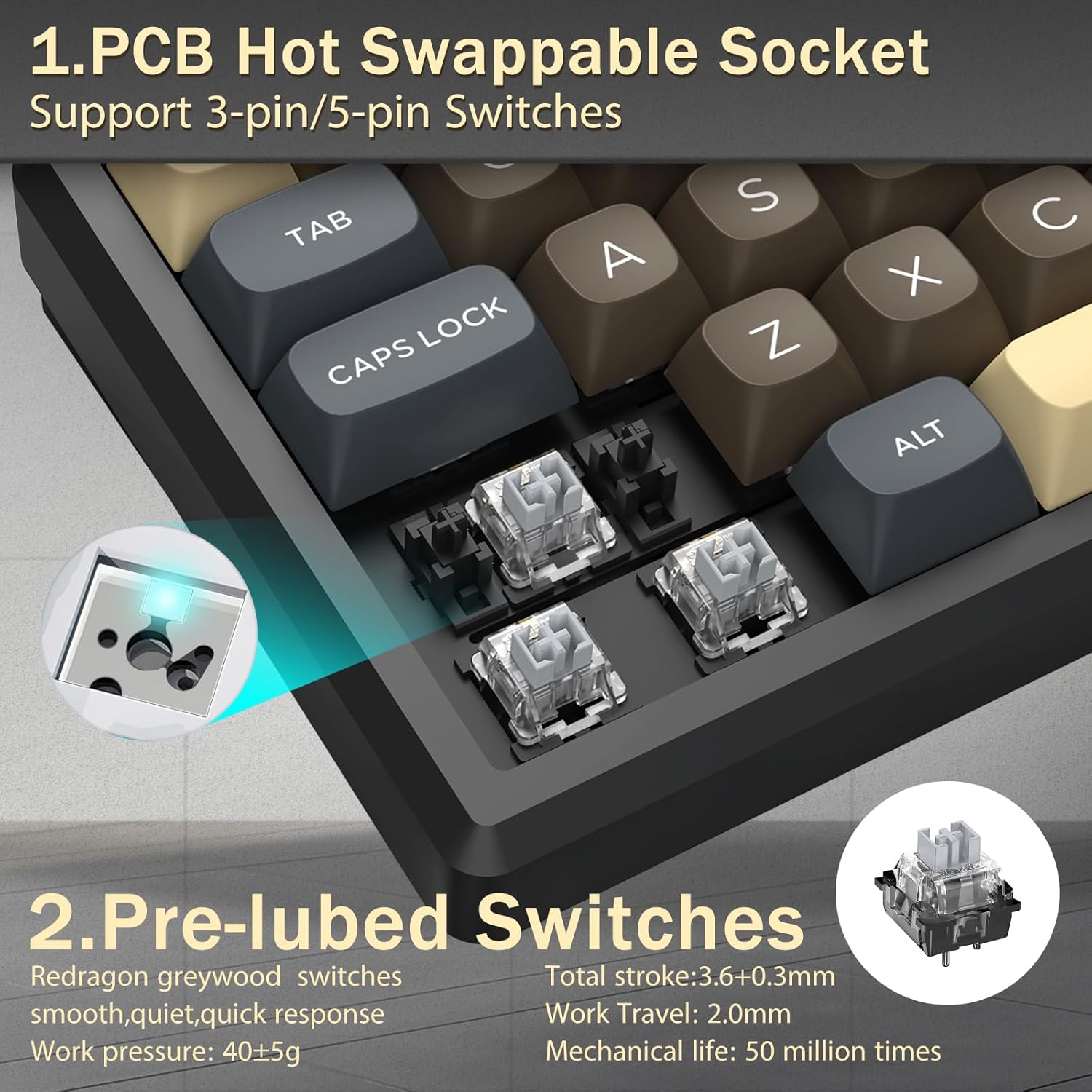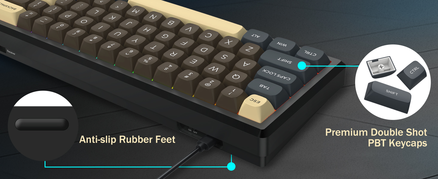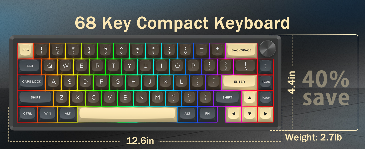 Dengan susun atur 60%, papan kekunci ini mengalih keluar kekunci yang tidak penting sambil mengekalkan fungsi teras melalui gabungan kekunci. Reka bentuk ini membantu mengurangkan kekacauan meja dan menyediakan lebih banyak ruang untuk pergerakan tetikus, menjadikannya sesuai untuk kedua-dua persekitaran permainan dan produktiviti.
