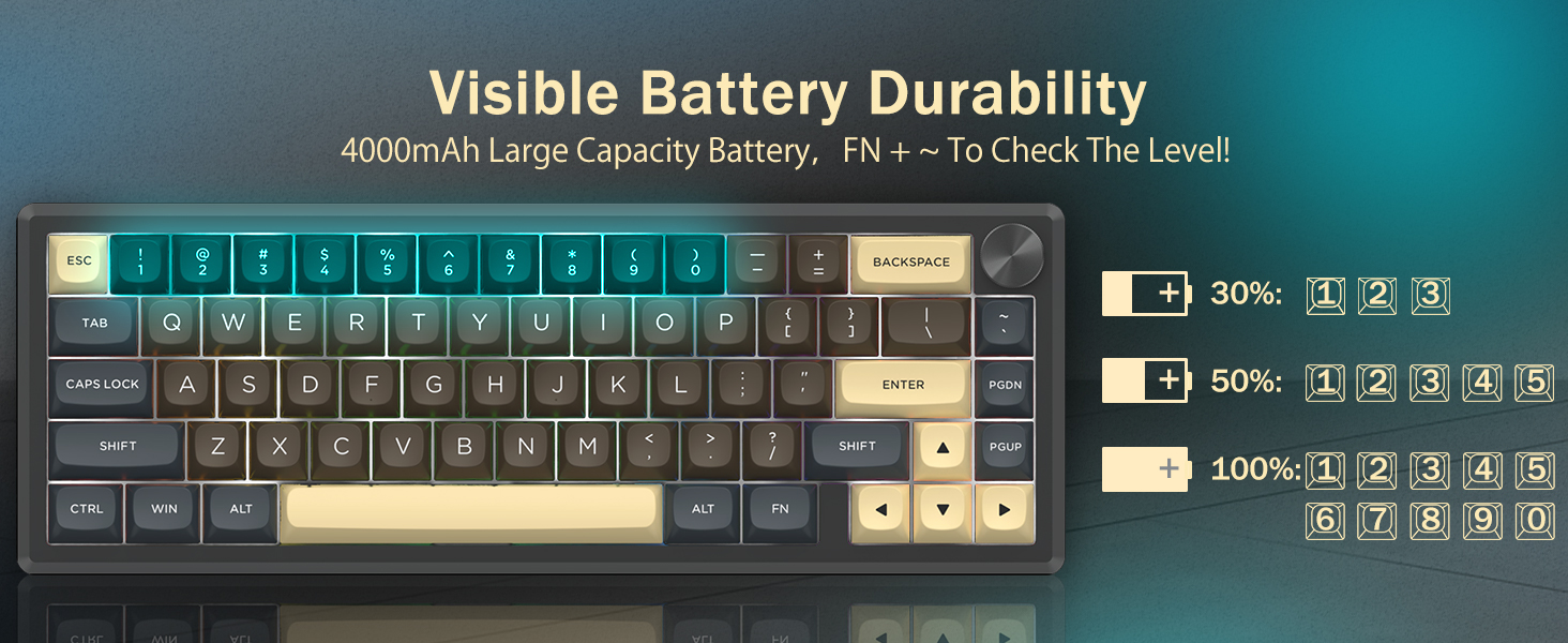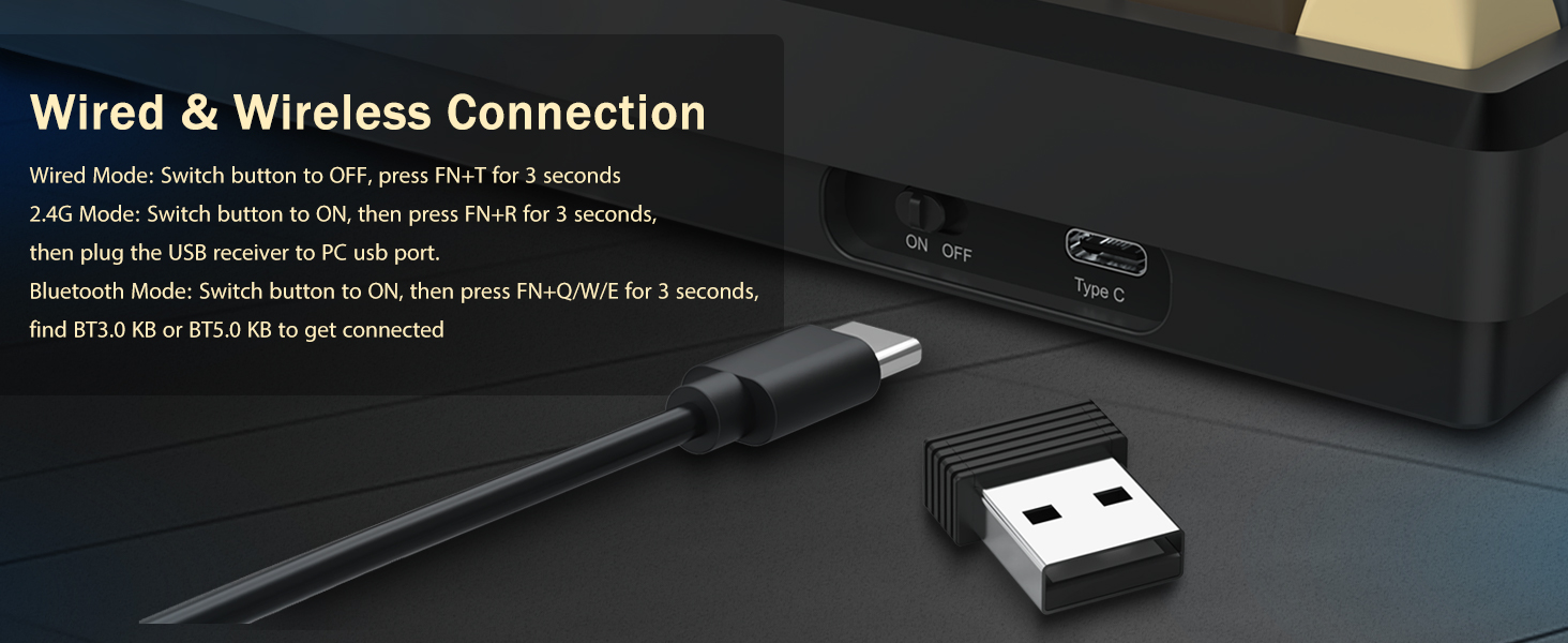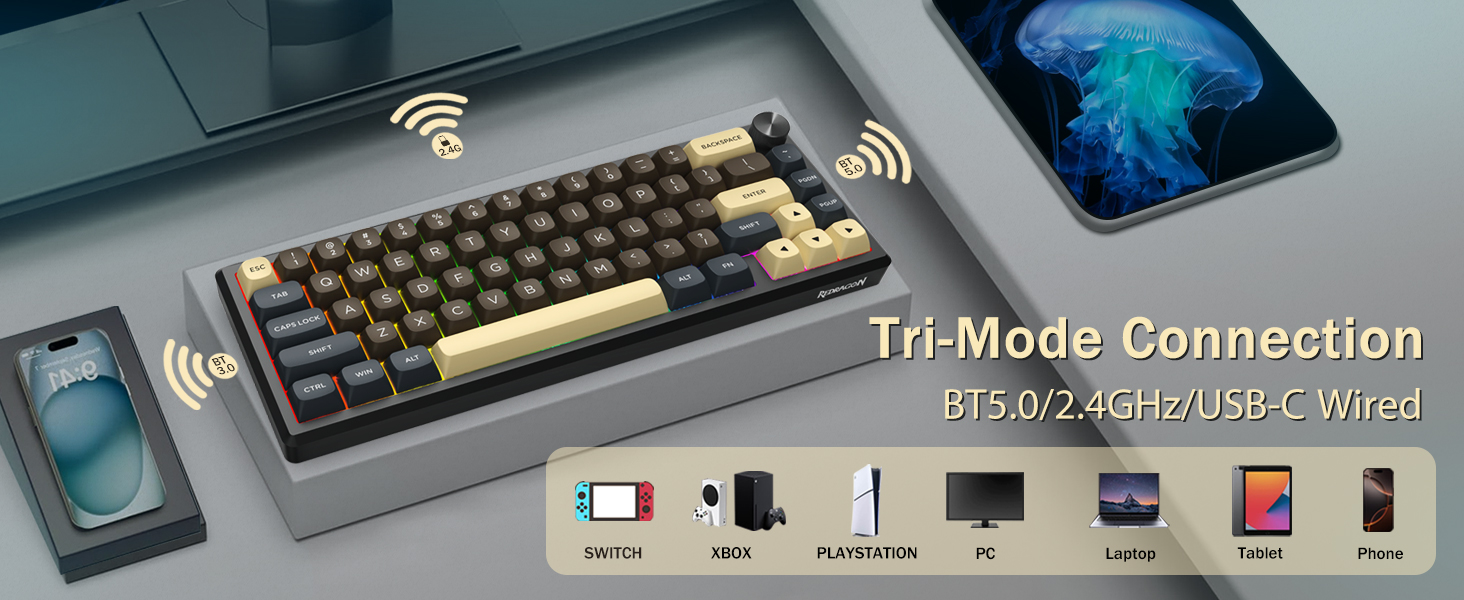 Papan kekunci menyokong sambungan wayarles untuk kemudahan dan sambungan USB berwayar untuk prestasi yang stabil. Pengguna boleh bertukar antara mod bergantung pada persediaan mereka.