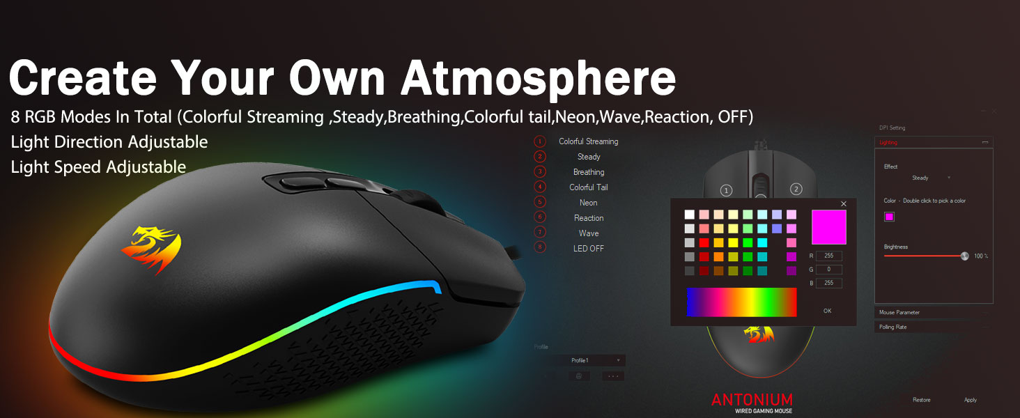8 mod backlit RGB yang layak- Hidupkan backlit dan buat beberapa pembunuhan di medan perang permainan anda. Getaran backlit RGB dinamik yang dinamik tidak akan pernah mengecewakan anda apabila menghiasi ruang permainan anda, lebih baik dengan aksesori redragon lain dengan lampu.