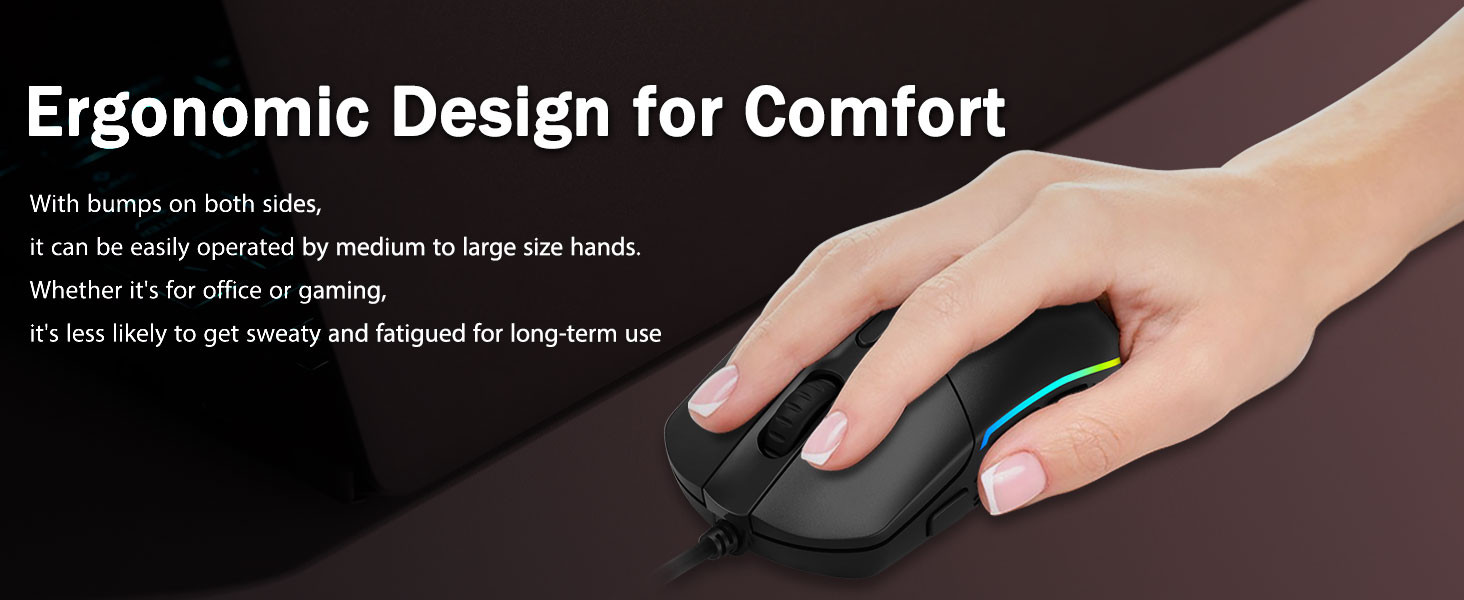 Cengkaman selesa- Benjolan ergonomik di kedua -dua belah membuat tikus permainan sesuai di mana -mana tangan. Ia memberikan keselesaan yang tahan lama untuk pemain, tanpa keletihan walaupun selama berjam-jam permainan yang sengit. Ia tidak akan tergelincir ketika mengangkat tetikus permainan, atau membuat swipes cepat dan tepat.