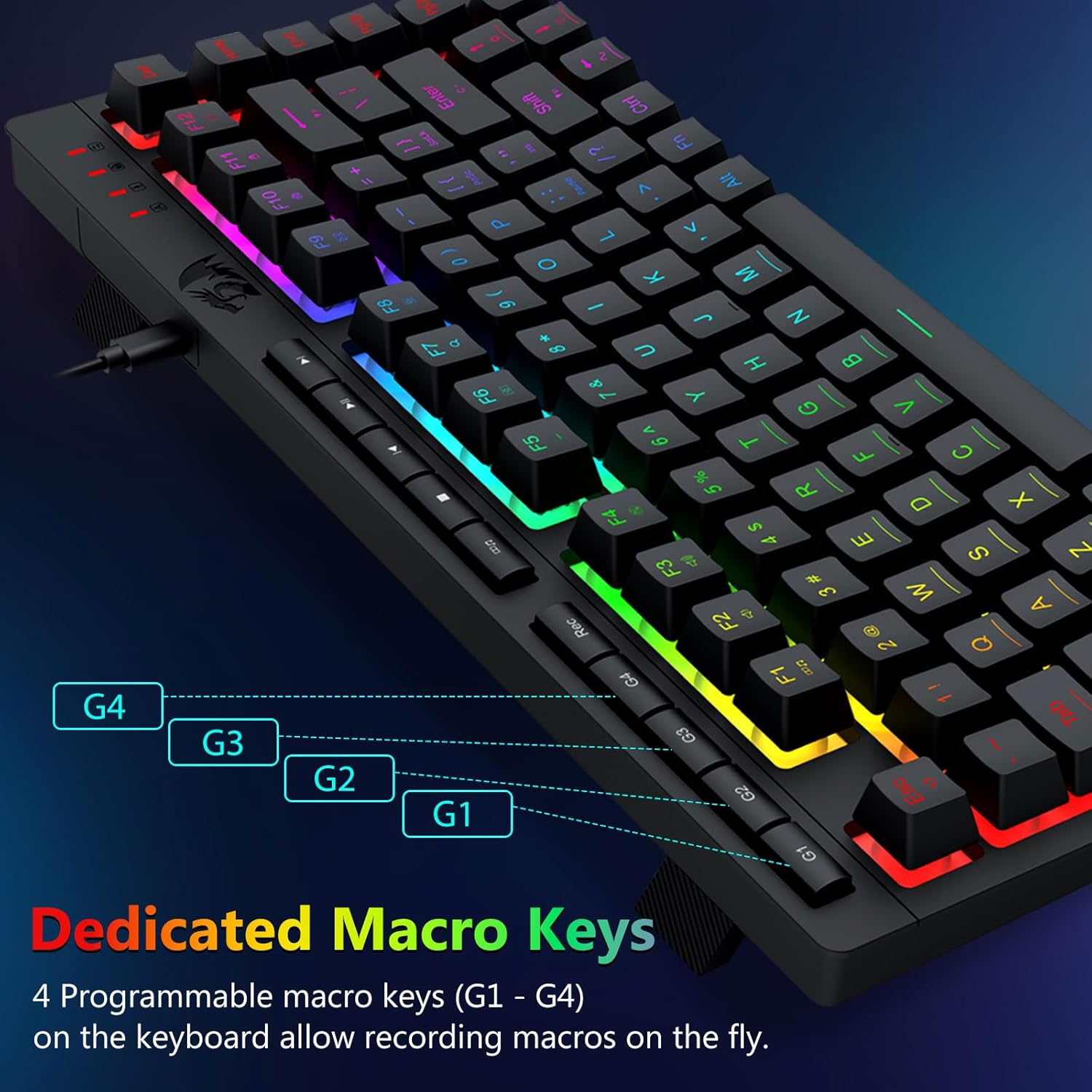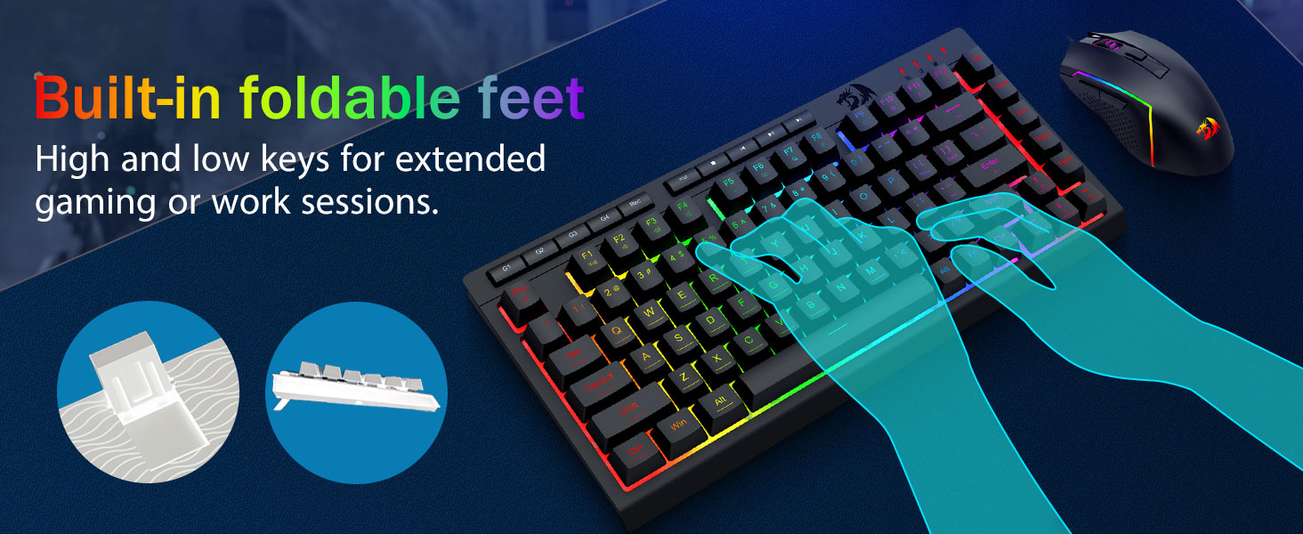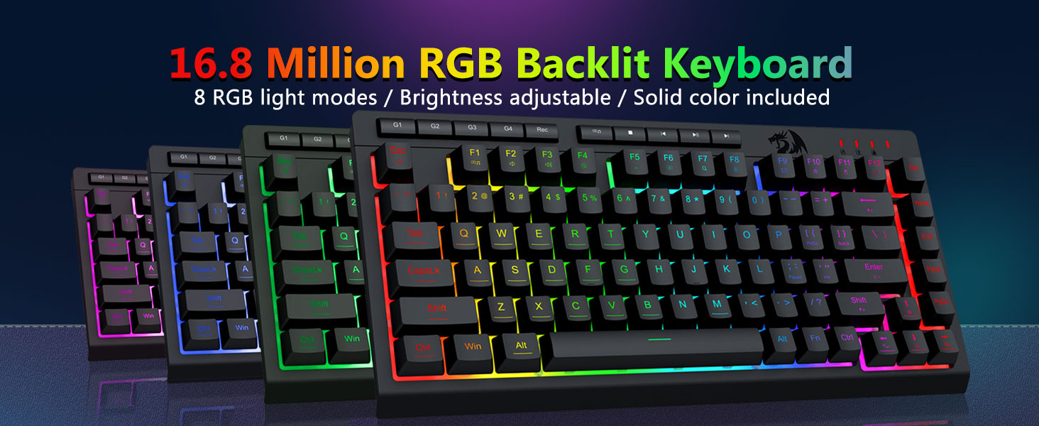【Papan kekunci permainan RGB dan tetikus】Papan kekunci permainan mempunyai 8 mod pencahayaan RGB untuk dipilih & tetikus permainan mempunyai 8 kesan pencahayaan untuk beralih antara, dan papan kekunci boleh diselaraskan untuk kelajuan 4 tahap dan kecerahan untuk memenuhi keutamaan anda. KeyCaps menawarkan latar belakang seragam yang jelas. Sama ada set itu adalah satu cahaya, perubahan kesan cahaya atau tiada cahaya sama sekali, papan kekunci permainan redragon dan tetikus akan memenuhi keperluan anda!