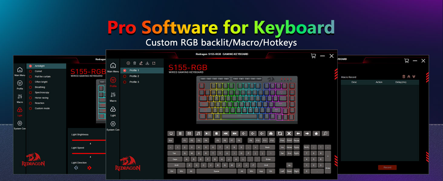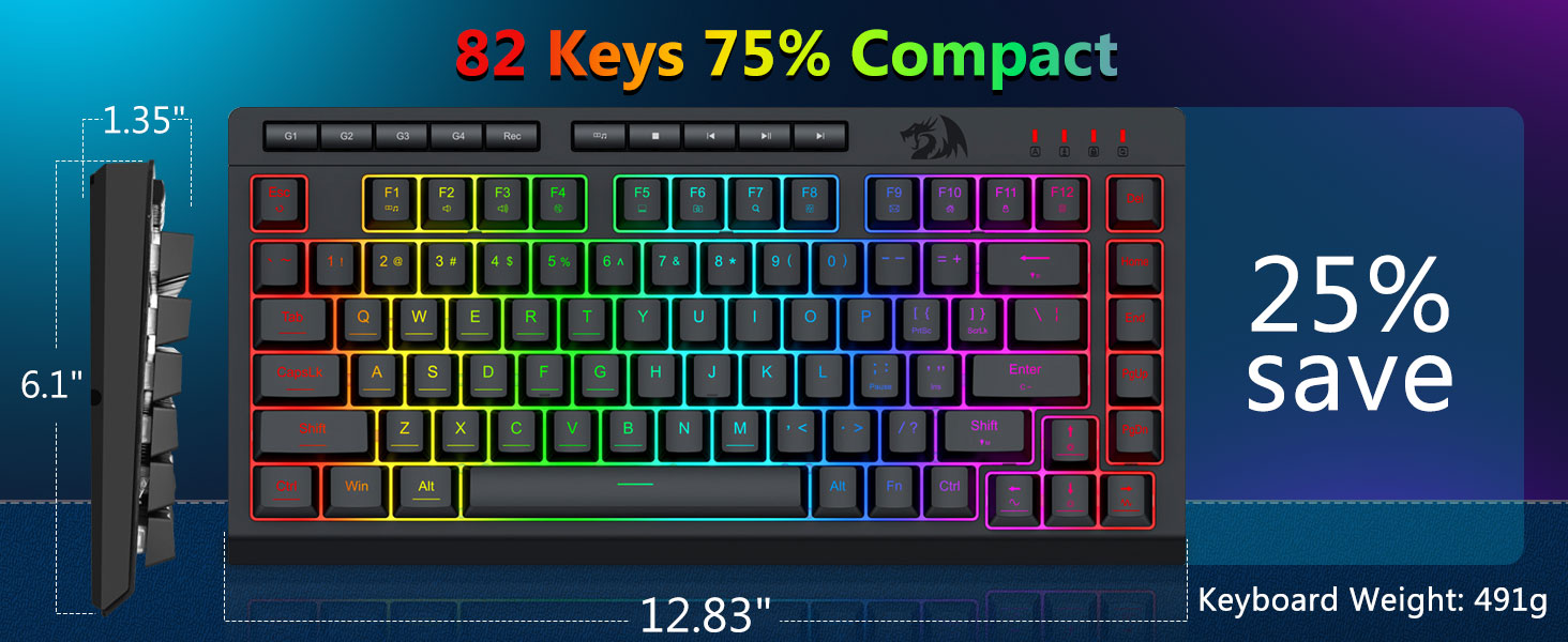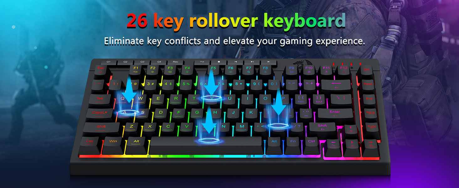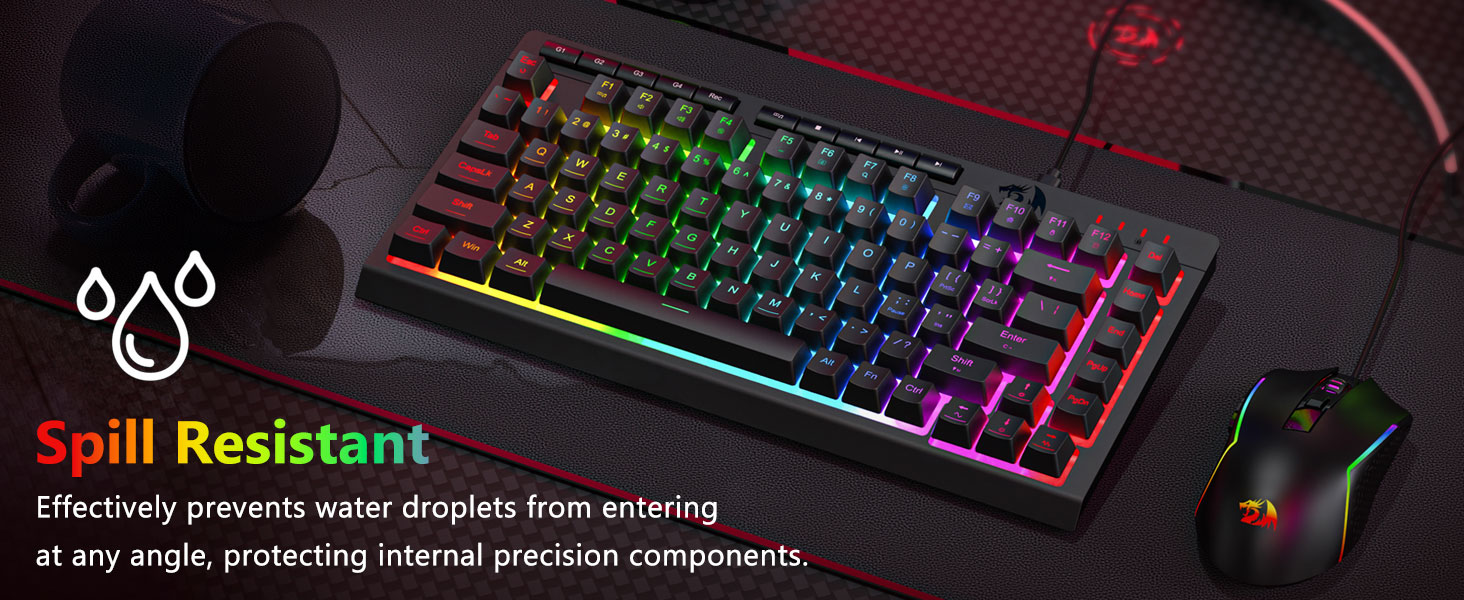 【Papan kekunci permainan RGB dan tetikus】Papan kekunci permainan mempunyai 8 mod pencahayaan RGB untuk dipilih & tetikus permainan mempunyai 8 kesan pencahayaan untuk beralih antara, dan papan kekunci boleh diselaraskan untuk kelajuan 4 tahap dan kecerahan untuk memenuhi keutamaan anda. KeyCaps menawarkan latar belakang seragam yang jelas. Sama ada set itu adalah satu cahaya, perubahan kesan cahaya atau tiada cahaya sama sekali, papan kekunci permainan redragon dan tetikus akan memenuhi keperluan anda!