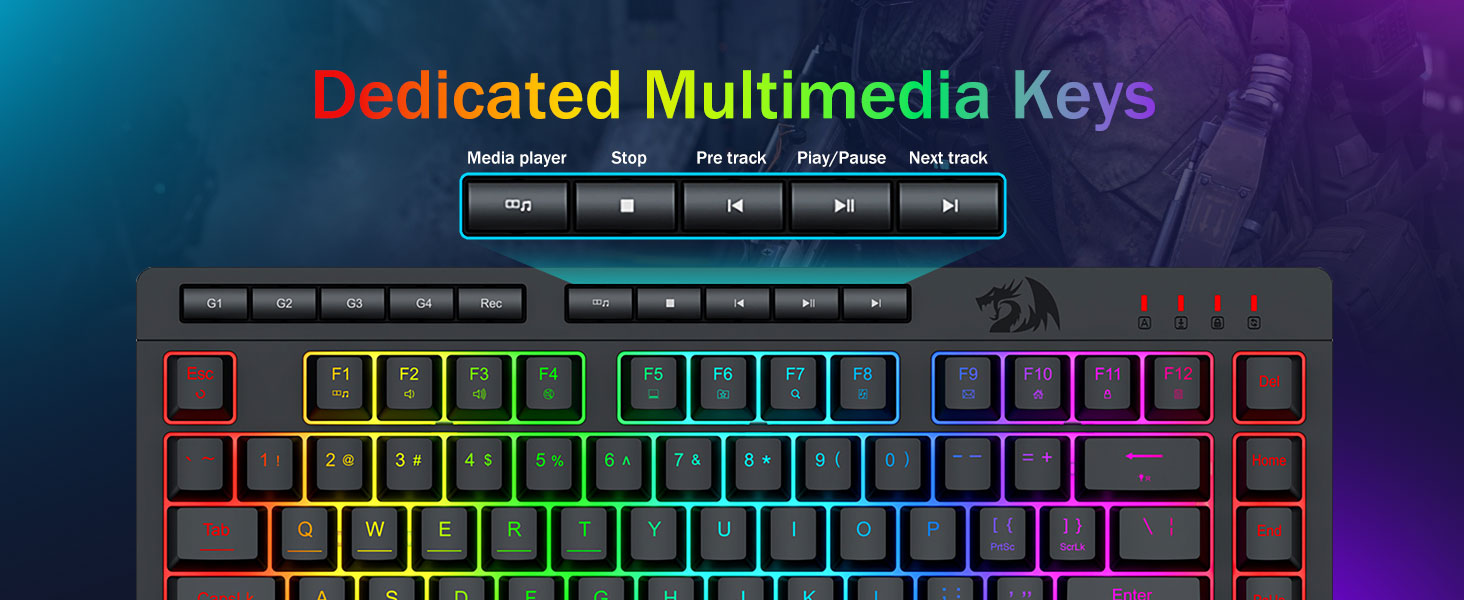 【Efisien & selesa】Papan kekunci permainan dan combo tetikus ini dilengkapi dengan 4 kunci makro di papan, 5 kunci multimedia bebas dan 12 kunci fungsi multimedia FN, mudah dan mudah untuk beroperasi. Ia bukan sahaja meningkatkan kecekapan tetapi juga menjadikan proses permainan anda lebih mudah dan lebih cepat