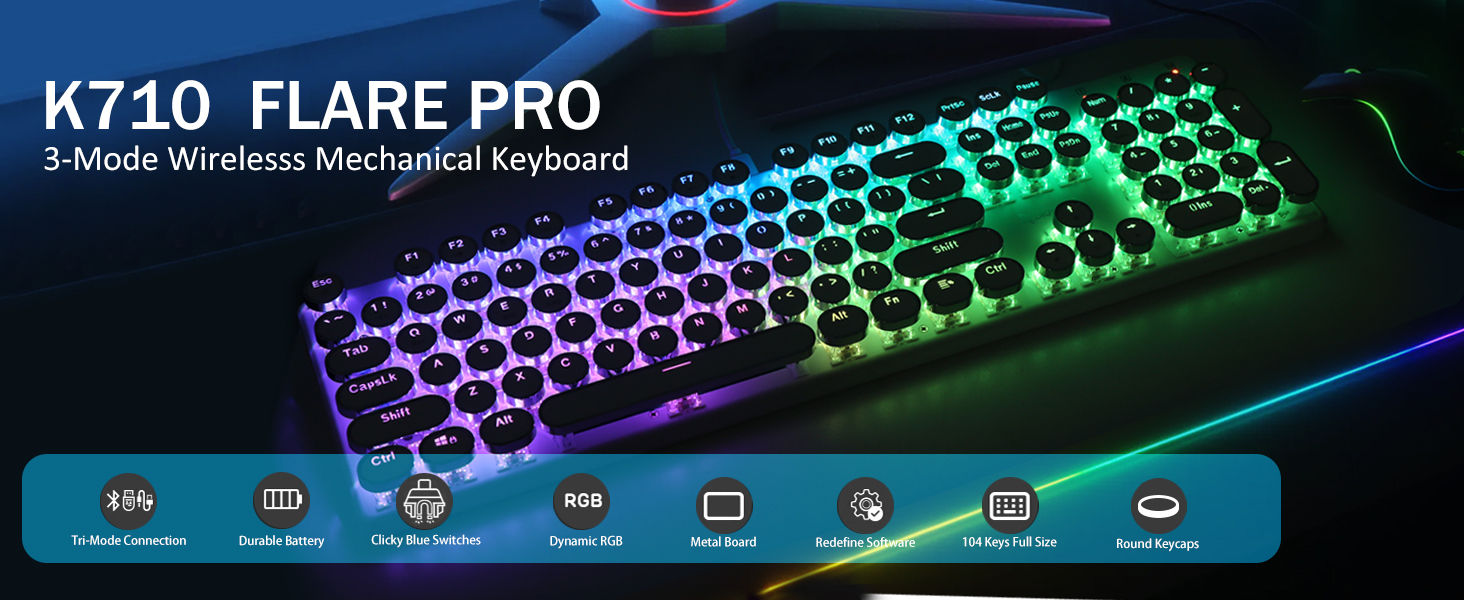 𝗗𝗲𝗽𝗲𝗻𝗱𝗮𝗯𝗹𝗲 𝗠𝗲𝘁𝗮𝗹 𝗣𝗮𝗻𝗲𝗹 & 𝟭𝟬𝟰 𝗞𝗲𝘆𝘀 𝗔𝗻𝘁𝗶 𝗚𝗵𝗼𝘀𝘁𝗶𝗻𝗴- Versi Flare Pro yang dinaik taraf terus menggunakan bahan logam pepejal tangki yang sama. Pastikan papan kekunci mantap dan elegan di atas meja, untuk pengalaman menaip premium. Papan kekunci K710 menyokong teknologi anti-ghosting 104-kunci, membolehkan pelbagai kunci ditekan pada masa yang sama tanpa konflik.