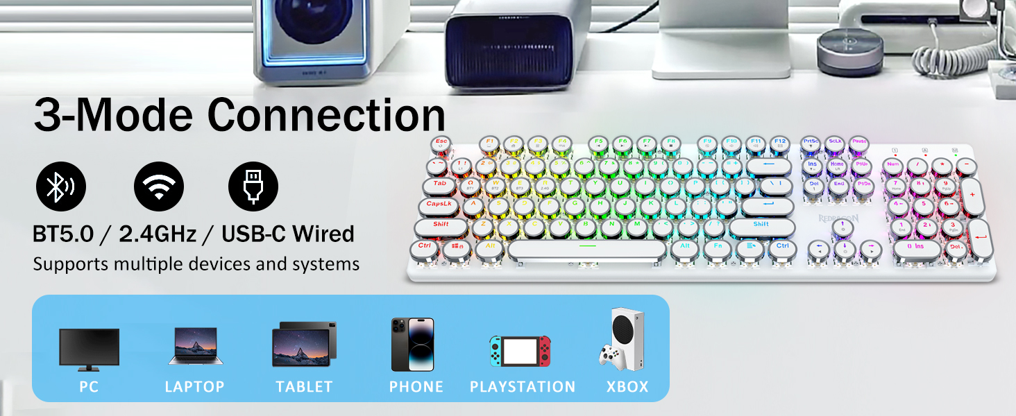 𝟯-𝗠𝗼𝗱𝗲 𝗖𝗼𝗻𝗻𝗲𝗰𝘁𝗶𝗼𝗻-Diharapkan dengan teknologi sambungan tri-mod yang inovatif Redragon, USB-C Wired, Bluetooth 3.0/5.0 & 2.4GHz mod tanpa wayar yang menjadikan pengalaman pengguna dinaik taraf ke tahap lain di semua bidang. Tekan FN+Q/W/E ke mod Bluetooth, tekan FN+R hingga mod 2.4g.
