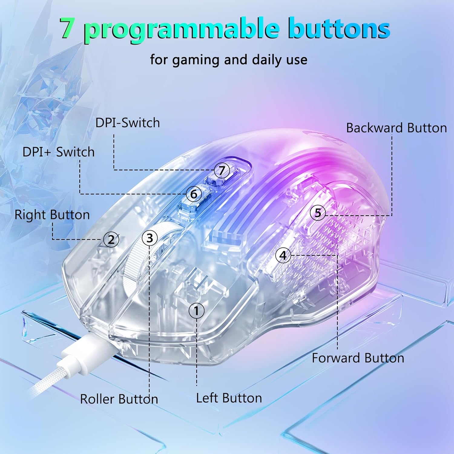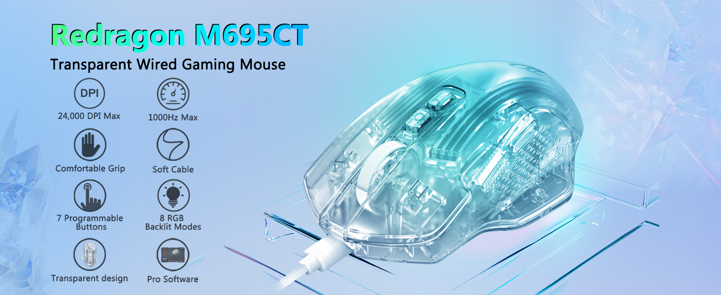 CHUANGQUAN White M695CT 24,000 DPI 8 RGB LED Backlit Mode Tetikus Permainan Berwayar menyampaikan penjejakan ultra-tepat, kawalan lancar dan pencahayaan dinamik, dibina untuk pemain yang menuntut kelajuan, ketepatan dan gaya.