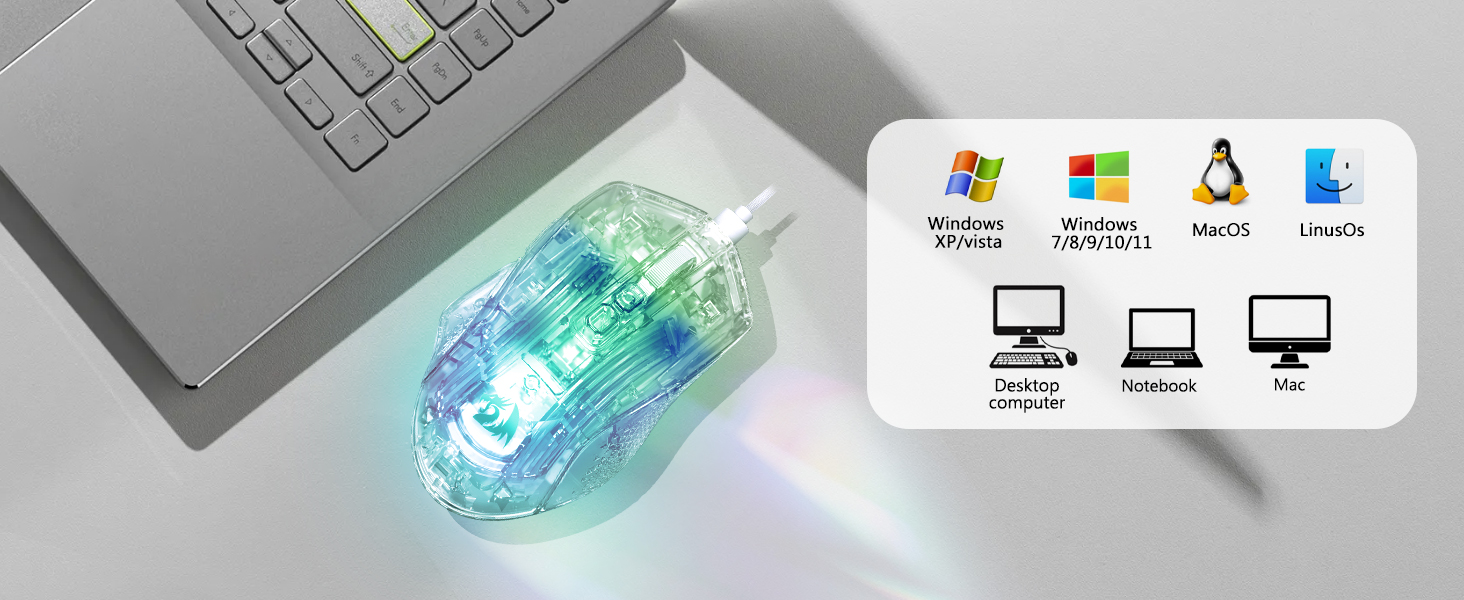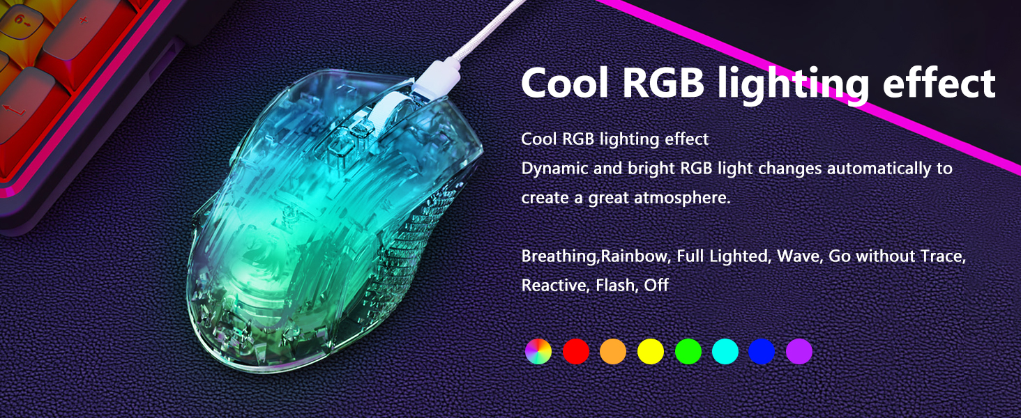 Tetikus termasuk lapan kesan pencahayaan RGB yang meningkatkan daya tarikan visual tanpa menjejaskan prestasi. Pengguna boleh bertukar antara mod pencahayaan untuk memadankan persediaan atau pilihan peribadi mereka.