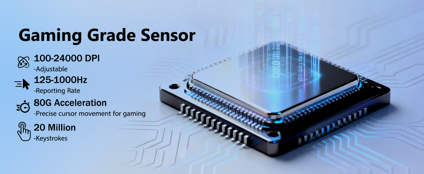 Tetikus dilengkapi dengan sensor optik canggih yang mampu mencapai sehingga 24,000 DPI. Ini membolehkan pengguna melaraskan sensitiviti mengikut senario yang berbeza, daripada penyasaran tepat dalam permainan kepada pergerakan kursor pantas merentas skrin besar.