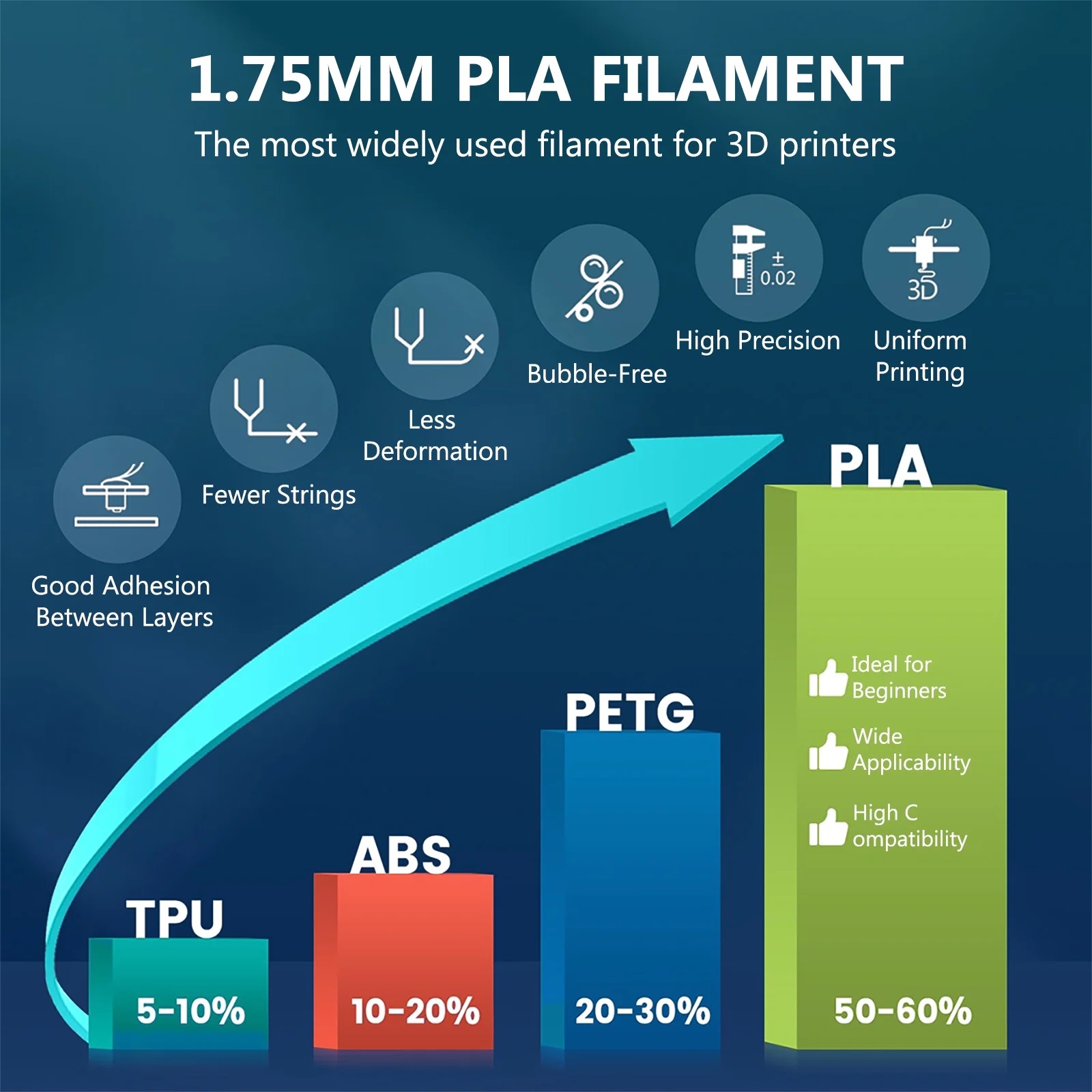 YaMeite White PLA 3D Printer Filament PLA Filament 1.75mm oleh Chuangquan adalah mesra alam, tidak berbau dan dibuat dengan ketepatan di China. Dimeterai dengan vakum dengan bahan pengering untuk kawalan kelembapan, ia mempunyai toleransi diameter yang ketat dan gelendong yang dililit kemas untuk penyusuan yang lancar. Serasi dengan kebanyakan pencetak FDM 1.75 mm; tetapan yang disyorkan: penyemperit 190–230°C, katil 45–60°C (katil dipanaskan pilihan), kipas 100%, kelajuan 40–100 mm/s. Chuangquan menawarkan bekalan China yang boleh dipercayai, penghantaran cepat, harga borong dan perkhidmatan terus kilang untuk pembeli global. Sesuai untuk prototaip, model dan pendidikan. Disokong oleh sokongan profesional dan kualiti yang konsisten. Filamen Pencetak 3D PLA Putih Filamen PLA 1.75mm – Bahan Kepersisan Tinggi untuk Pencetakan 3D Dipercayai Pertumbuhan pembuatan aditif telah mengubah cara pereka bentuk, jurutera, pendidik dan penggemar mencipta objek fizikal. Antara pelbagai bahan yang digunakan dalam pencetakan 3D pemodelan pemendapan bersatu (FDM), PLA kekal sebagai salah satu filamen yang paling banyak diterima pakai kerana kemudahan penggunaannya, kemesraan alam sekitar dan kualiti cetakan yang sangat baik. Filamen Pencetak 3D PLA Putih Filamen PLA 1.75mm direka khusus untuk memberikan penyemperitan yang konsisten, kemasan permukaan licin dan ketepatan dimensi yang boleh dipercayai merentas pelbagai aplikasi pencetakan 3D. Sama ada digunakan untuk prototaip, reka bentuk kreatif, projek pendidikan atau komponen berfungsi, filamen PLA berkualiti tinggi memainkan peranan penting dalam mencapai hasil cetakan yang berjaya. Filamen Pencetak 3D PLA Putih premium PLA Filament 1.75mm memastikan suapan yang stabil melalui pencetak, meledingkan minimum semasa pencetakan dan permukaan putih yang menarik secara visual yang menyerlahkan butiran reka bentuk yang halus. Panduan komprehensif ini meneroka ciri, spesifikasi, ciri prestasi dan kelebihan praktikal filamen PLA putih dengan diameter 1.75mm, membantu pengguna memahami mengapa ia kekal sebagai bahan pilihan dalam pencetakan 3D desktop moden.